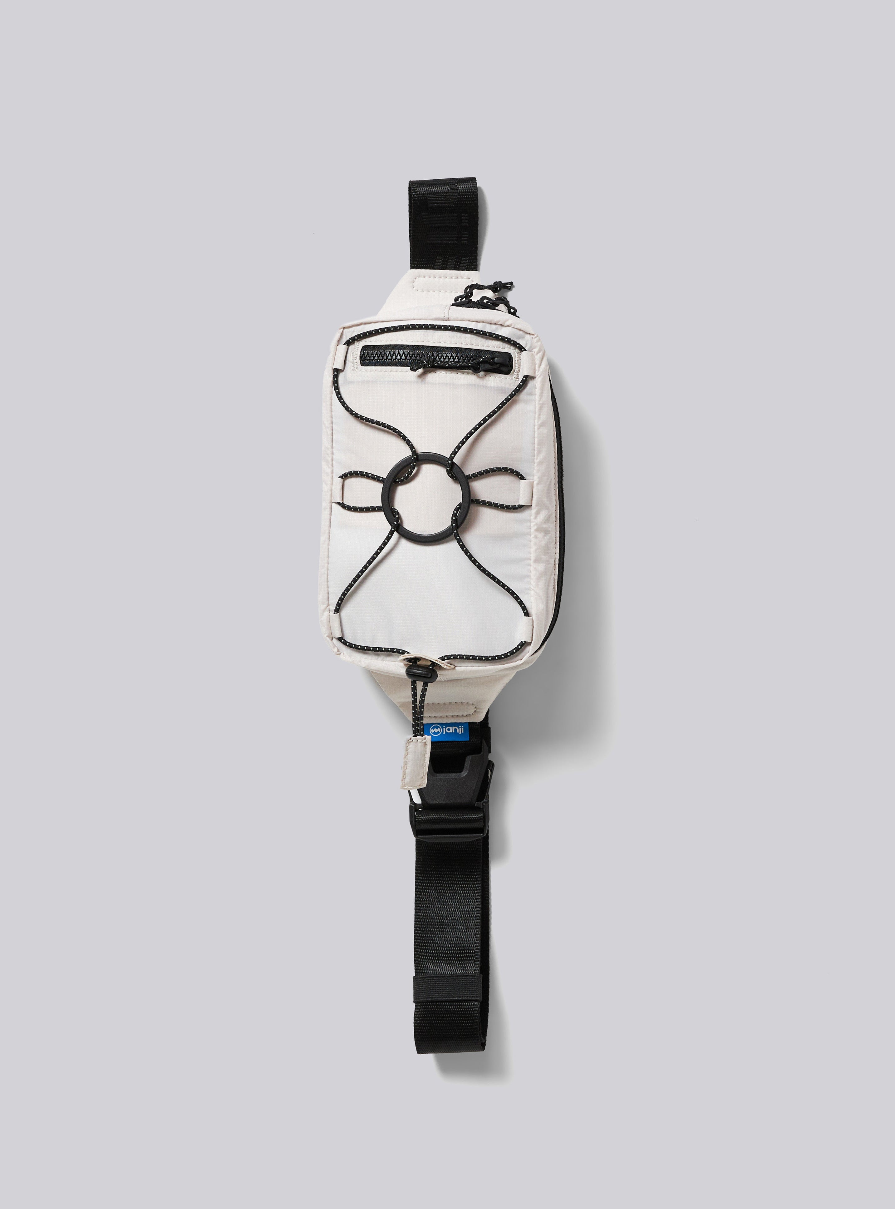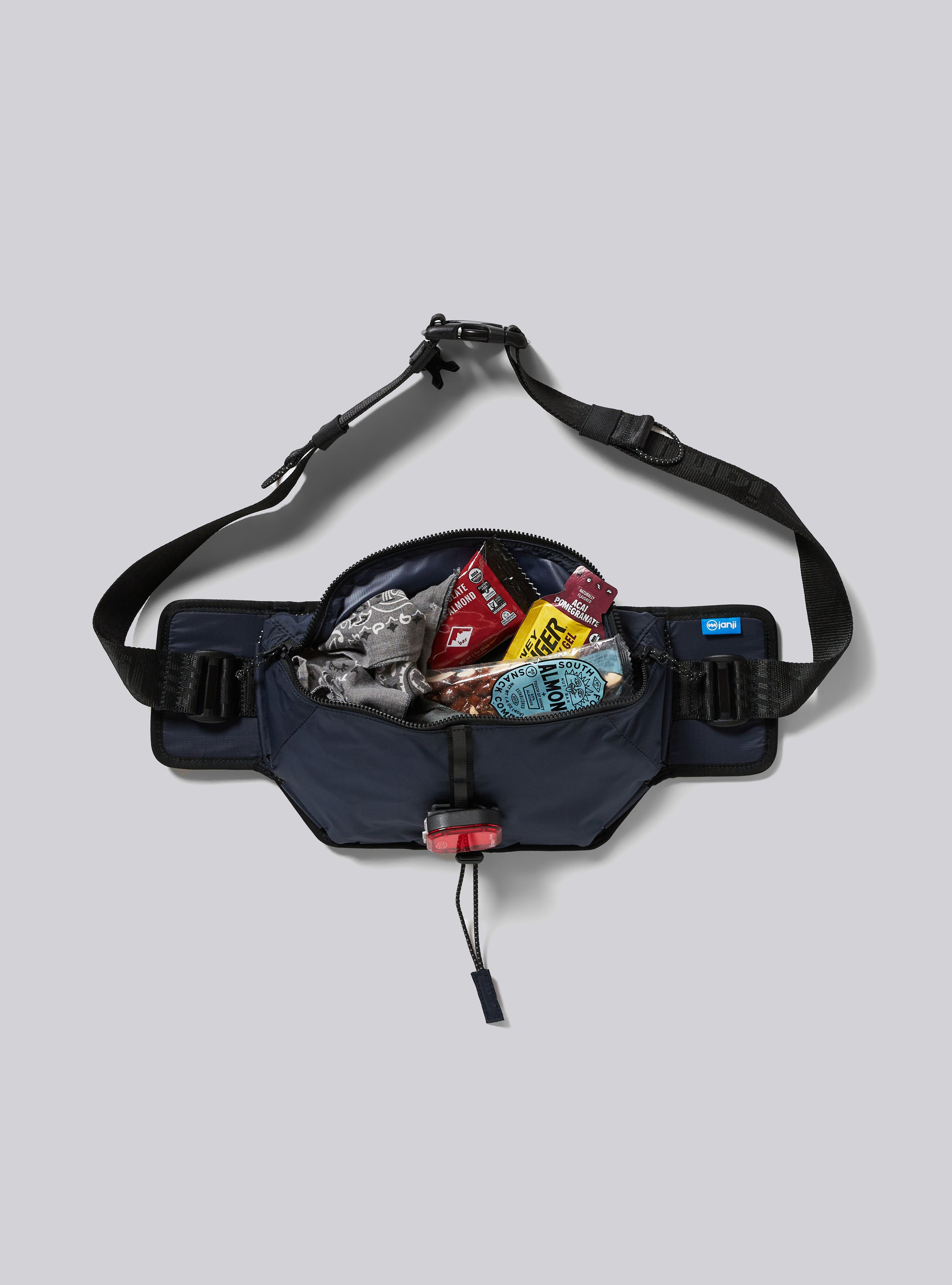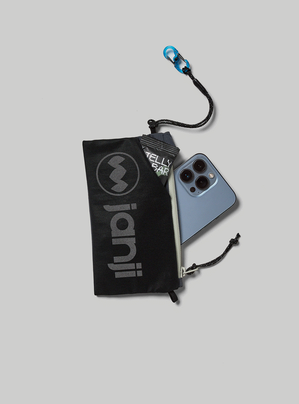 - Two zip pockets on the front chest straps include a safety whistle, Janji signature blue s-biner key clip, and can fit the largest sized phones